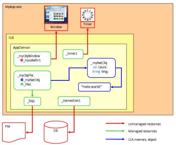 - Managed resources, such as _myObjWindow, _myObjFile, _timer1, _file1, _connection1. They are .NET classes which have direct unmanaged fields and/or other managed resource as fields. Their memory space is managed by the CLR.